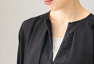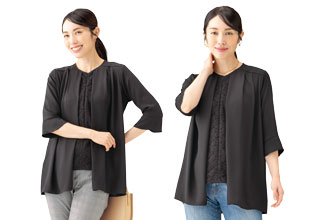 一枚なのに、ブラウスと重ね着したように見えるデザインで、エレガンスを演出。